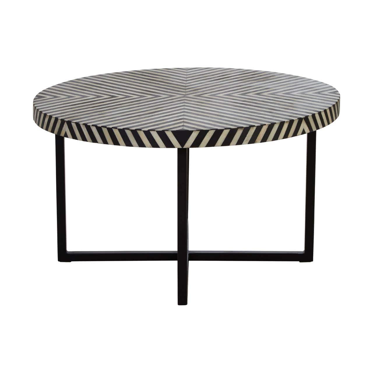 Expertly handcrafted, this coffee table is made from black metal, straight legs that combine to form a cross-leg base and an acacia wood tabletop with bone inlay detailing. The minimal, monochromatic side table can be styled with more coordinating furniture within the boho range.