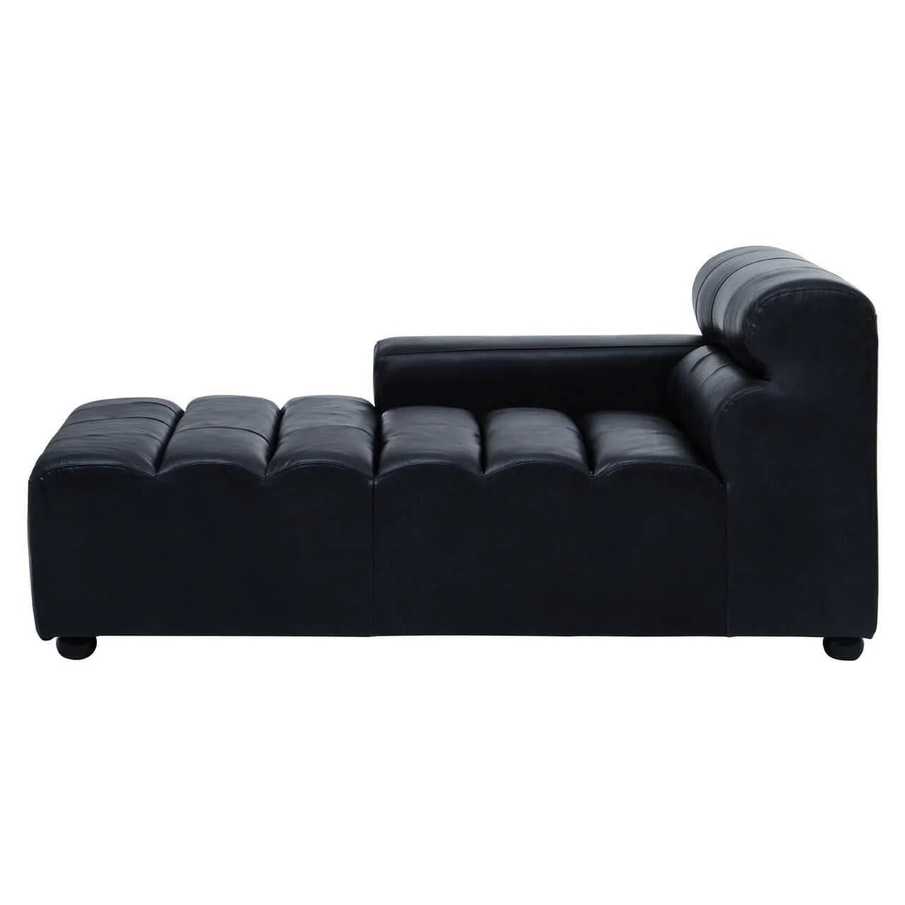 Covered in genuine distressed slate leather, this right chaise has an elegant tuxedo arm and scrolled back. Channel detail contributes to the depth and texture of the design, supported by matching eco-friendly orb feet.